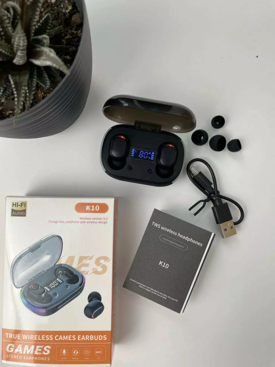 Беспроводные наушники Earbuds К10 – легкие и компактные наушники с микрофоном – они станут незаменимым аксессуаром в любое время и в любом месте. Наушники изготовлены из качественных и приятных на ощупь материалов, которые не раздражают кожу во время длительного использования и занятия спортом, имеют цифровой дисплей. При этом они легкие и компактные, имеют удобный футляр с павербанком. Идеально подходят для повседневного использования и спорта. Благодаря специальной анатомической форме хорошо держатся, не выпадают из ушей при активном использовании.