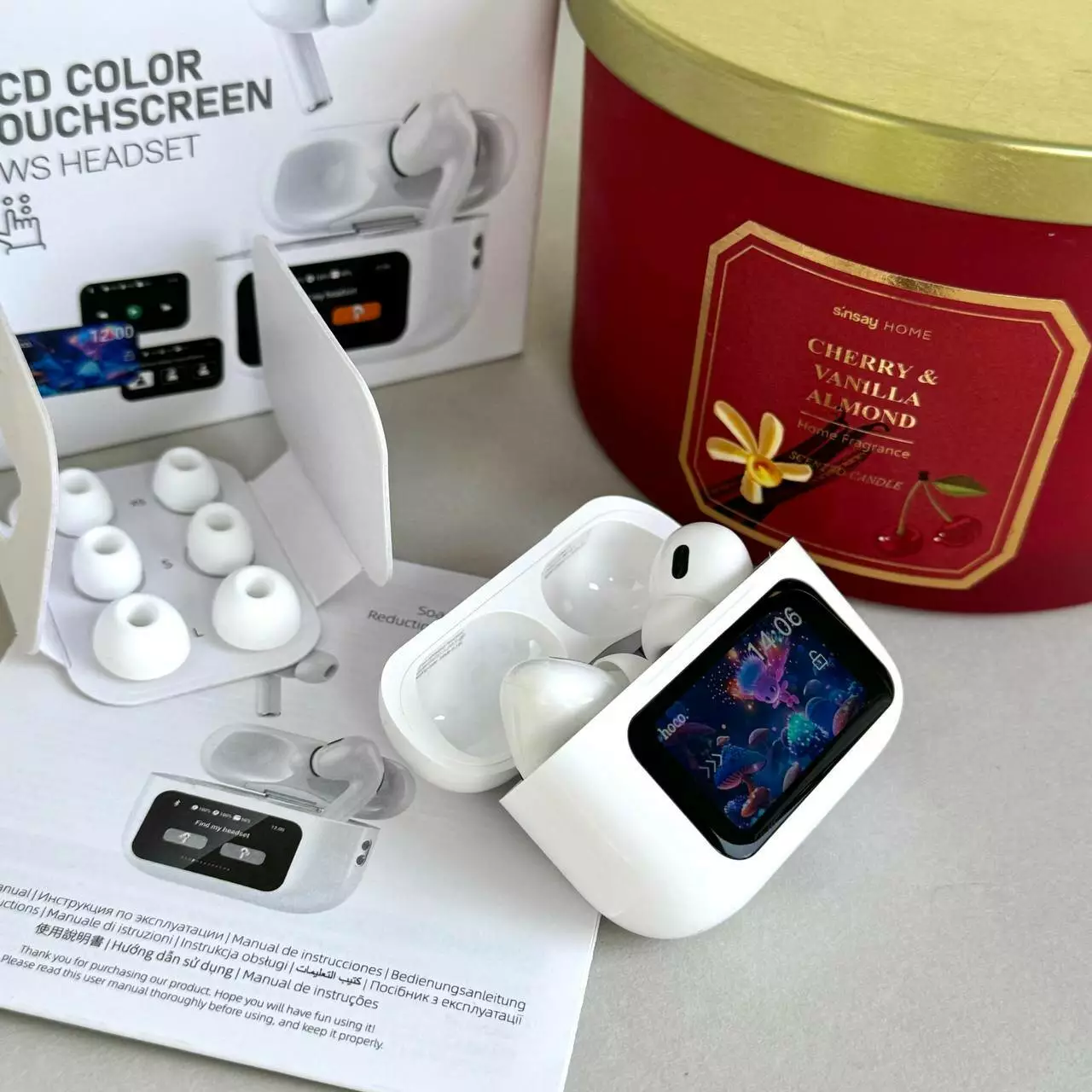 - Управление происходит прикосновением к сенсорному экрану, расположенному на кейсе наушников.