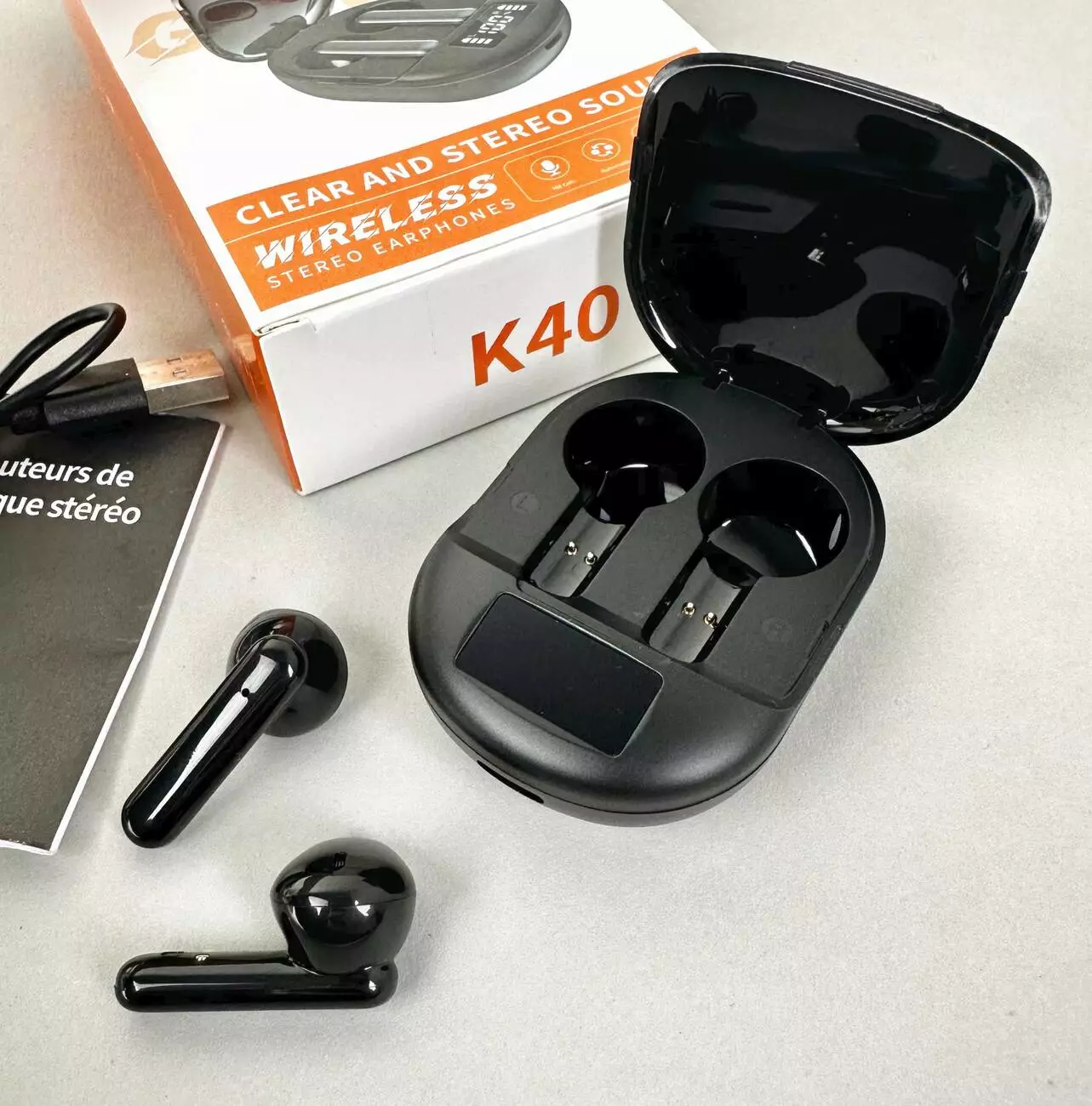 Бездротові навушники K40 series, EarBuds, Smart Case (Чорний) – це сучасна гарнітура, створена для комфортного прослуховування музики, спілкування та щоденного використання. Навушники оснащені чіпом Bluetooth 5.3, який забезпечує стабільне з'єднання та високу якість звуку без затримок. Компактний дизайн та ергономічна форма забезпечують зручну посадку, а цифровий індикатор заряду дозволяє контролювати рівень батареї.