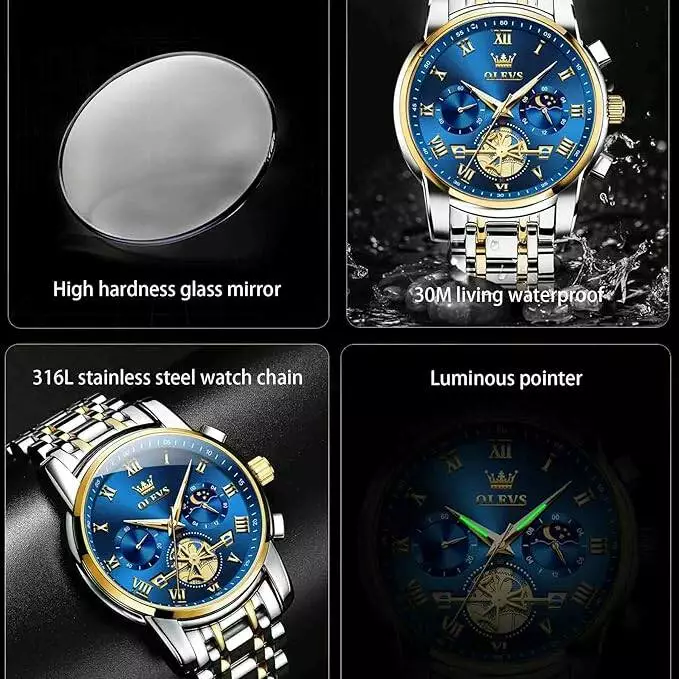 Часы наручные OLEVS 2859 – стильный аксессуар, сочетающий классическую элегантность с практичными функциями. Благодаря высокоточному кварцевому механизму часы держат точное время. Три дополнительных циферблата хронографа помогут отслеживать время с точностью до секунд, а световое покрытие на стрелках сделает чтение в темноте удобным. Корпус из сплава с вакуумным покрытием сочетается с прочным браслетом из нержавеющей стали – идеальное сочетание прочности и эстетики. Наличие водозащиты позволяет не снимать часы во время дождя или мытья рук.