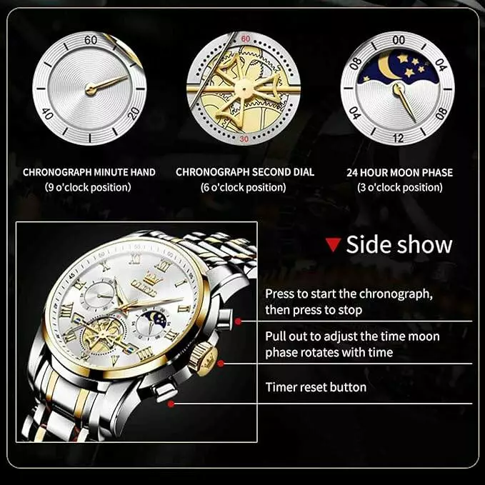Часы наручные OLEVS 2859 – стильный аксессуар, сочетающий классическую элегантность с практичными функциями. Благодаря высокоточному кварцевому механизму часы держат точное время. Три дополнительных циферблата хронографа помогут отслеживать время с точностью до секунд, а световое покрытие на стрелках сделает чтение в темноте удобным. Корпус из сплава с вакуумным покрытием сочетается с прочным браслетом из нержавеющей стали – идеальное сочетание прочности и эстетики. Наличие водозащиты позволяет не снимать часы во время дождя или мытья рук.