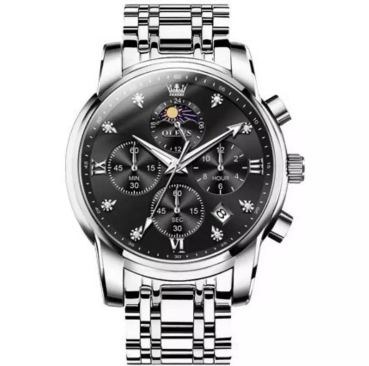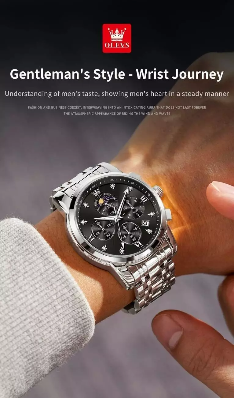 Часы наручные OLEVS 3655 – это сочетание сдержанной классики и многофункциональности. Они подойдут как для делового образа, так и для активной повседневной носки. Благодаря высокоточному японскому кварцевому механизму Citizen часы демонстрируют стабильный ход. Хронограф с тремя субциферблатами, индикатор фазы луны и двойной календарь (день/дата) делают этот аксессуар чрезвычайно практичным. Световое покрытие на стрелках обеспечивает удобство чтения в темноте, а водозащита 3 ATM позволяет не снимать часы во время дождя или мытья рук. Корпус из прочного сплава и ремешок из нержавеющей стали гарантируют долговечность, а стекло Hardlex защищает от царапин.