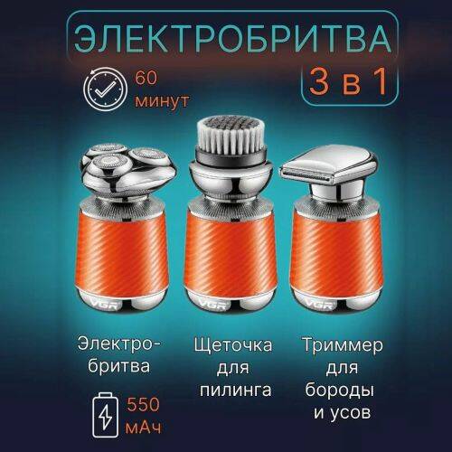 Электробритва 3в1 VGR V-391 с 3 насадками LED (Оранжевый) — универсальный прибор для мужского ухода, сочетающий три функции: роторную бритву с тремя плавающими головками, выдвижной триммер и щеточку для пилинга. Роторная система с плавающими головками обеспечивает гладкое и быстрое бритье по контуру лица. Дизайн IPX7 позволяет промывать прибор под струей воды, делая чистку простой и гигиеничной. Компактный эргономичный корпус уверенно лежит в руке и идеально подходит для дома или дороги.