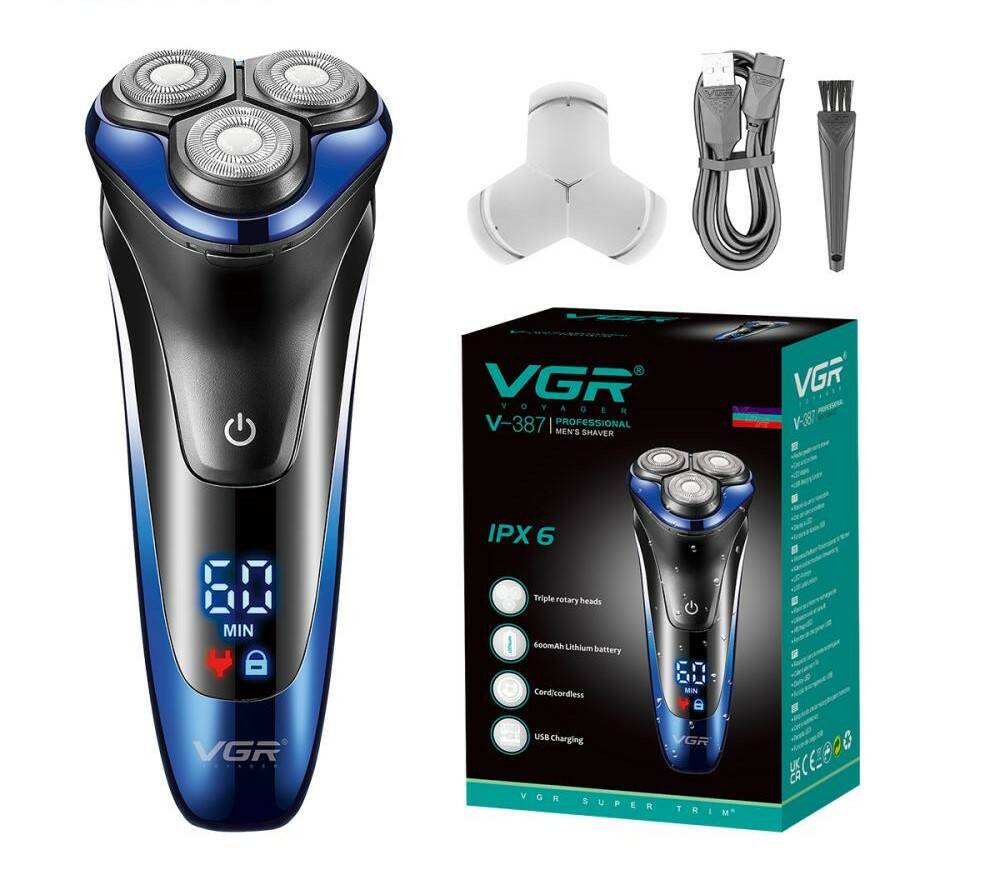 Електробритва роторна VGR V-387 LED – роторна модель з трьома плаваючими головками та вбудованим висувним триммером, створена для ретельного гоління по контуру обличчя. Рівень захисту IPX6 забезпечує захист від води та дозволяє легко промивати робочі частини. Акумулятор на 600 mAh дає до 60 хвилин автономної роботи після зарядки приблизно в 1,5 години через USB. LED-дисплей відображає рівень заряду, корпус у сучасному дизайні – поєднання практичності та стилю, ідеально для дому чи поїздок.