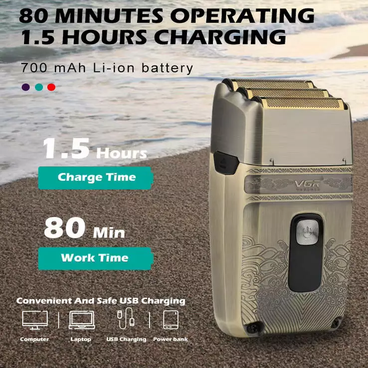 Електробритва шейвер VGR V-335 LED - сучасна роторна модель з трьома плаваючими головками, що забезпечує максимально комфортне та ефективне гоління. Її конструкція дозволяє головкам повторювати контури обличчя, що гарантує чистий і рівний результат навіть у важкодоступних місцях. Бритва підходить як для сухого, так і для вологого гоління, тому ви можете використовувати її з пінкою, гелем або просто на сухій шкірі.