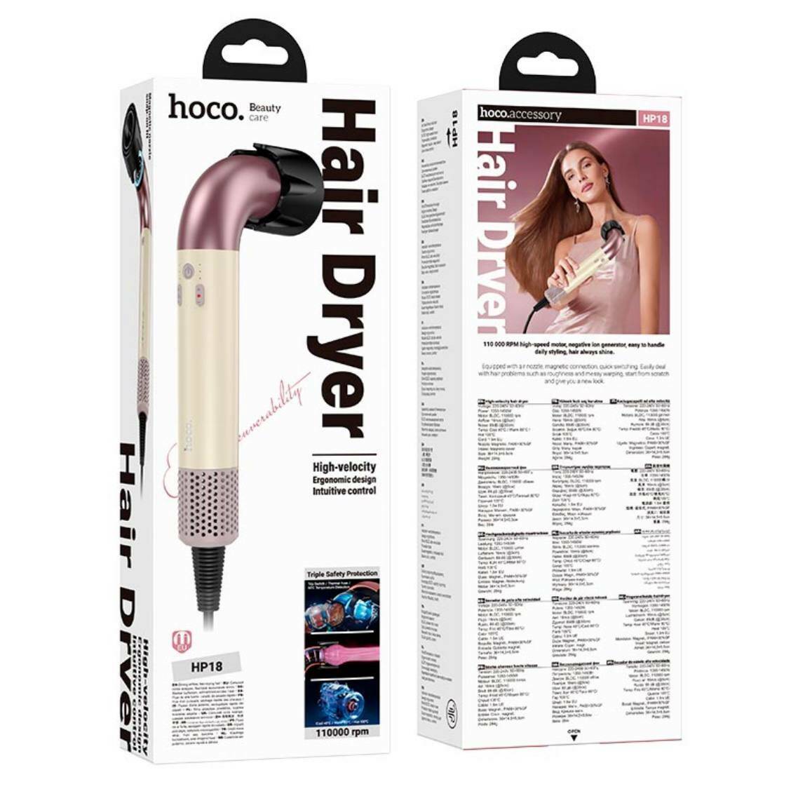 Фен для волосся Hoco HP18 High Velocity - потужний високошвидкісний фен для швидкого та безпечного сушіння волосся. Завдяки високошвидкісному двигуну та продуманій системі повітряного потоку він забезпечує швидке сушіння волосся без пересушування та пошкоджень. Фен підтримує кілька режимів температури та швидкості, що дозволяє легко підібрати налаштування для різних типів волосся. Функція іонізації зменшує пухнастість, запобігає електризації та робить волосся гладким і блискучим. Фен ідеально підходить як для домашнього використання, так і для професійних майстрів. Легка вага та ергономічна форма зменшують навантаження на руку навіть при тривалому використанні.