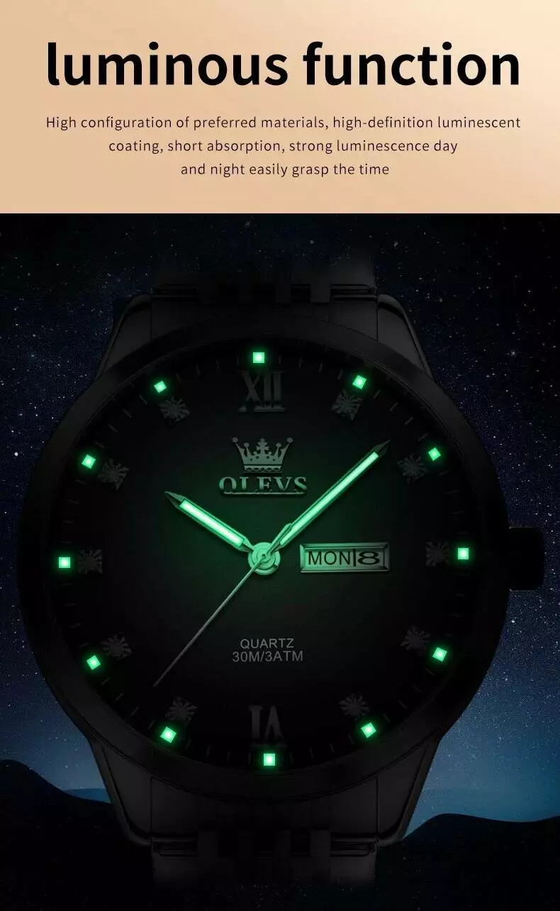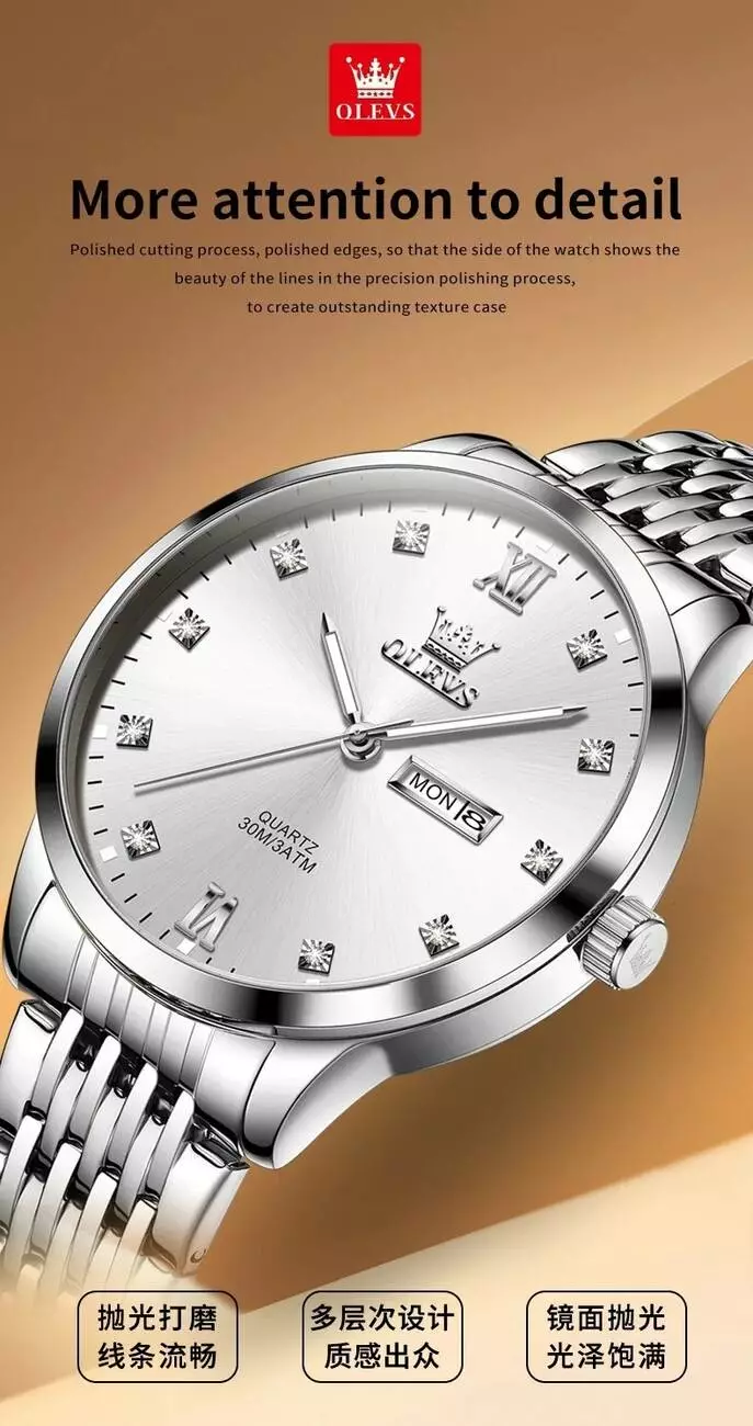 Годинник наручний OLEVS 2943 – стильний і функціональний аксесуар, який поєднує в собі сучасний дизайн і надійність. Ідеально підходить для повсякденного використання і доповнить будь-який образ. Завдяки японському кварцовому механізму забезпечується точний хід. Водостійкість до 3 ATM дозволяє не турбуватися про випадковий контакт з водою. Світлові стрілки забезпечують зручне читання часу в темряві, а подвійний календар (день/дата) допомагає завжди бути в курсі важливих дат. Міцний корпус і ремінець з нержавіючої сталі гарантують довговічність виробу.
