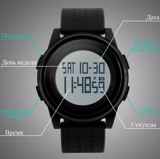 - Функції: Дата, день тижня, секундомір, будильник, підсвічування