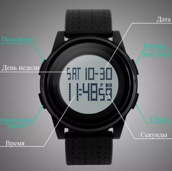 - Функції: Дата, день тижня, секундомір, будильник, підсвічування