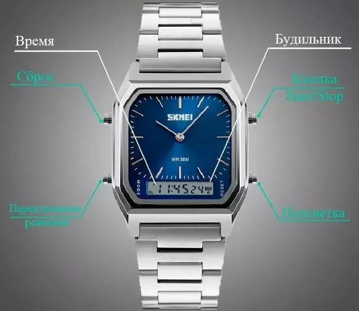 - Циферблат: Змішаний (стрілочний+цифровий)