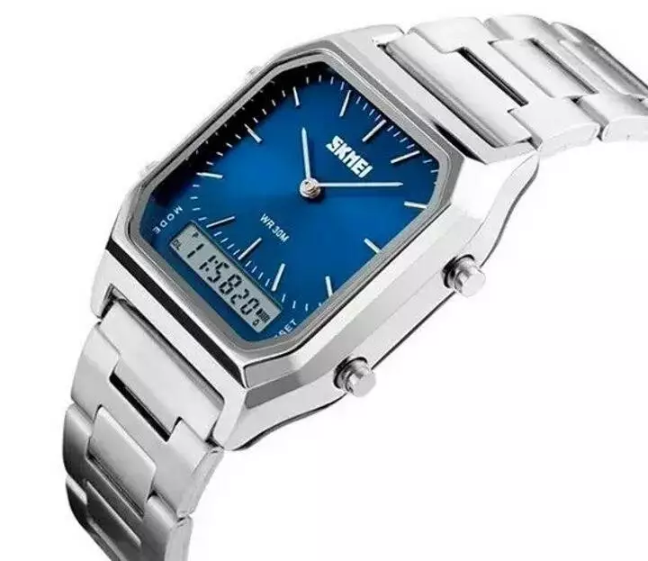 Годинник наручний Skmei - це стильний чоловічий аксесуар, що поєднує сучасний дизайн, функціональність і надійність. Короткий корпус і продумані деталі дозволяють гармонійно поєднувати модель як з повсякденним одягом, так і з діловим костюмом. Міцний браслет з надійною застібкою забезпечує комфорт та довговічність. Комбінована індикація зі стрілками та електронним дисплеєм доповнюється набором корисних функцій: відображення дати, дня тижня, місяця, секундомір, будильник, підсвічування, другий часовий пояс та вибір 12/24-годинного формату. Точний кварцовий механізм гарантує стабільну роботу, а захист від бризок робить годинник зручним для щоденного використання. Це ідеальний вибір для чоловіків, які цінують стиль, комфорт та функціональність в одному аксесуарі.