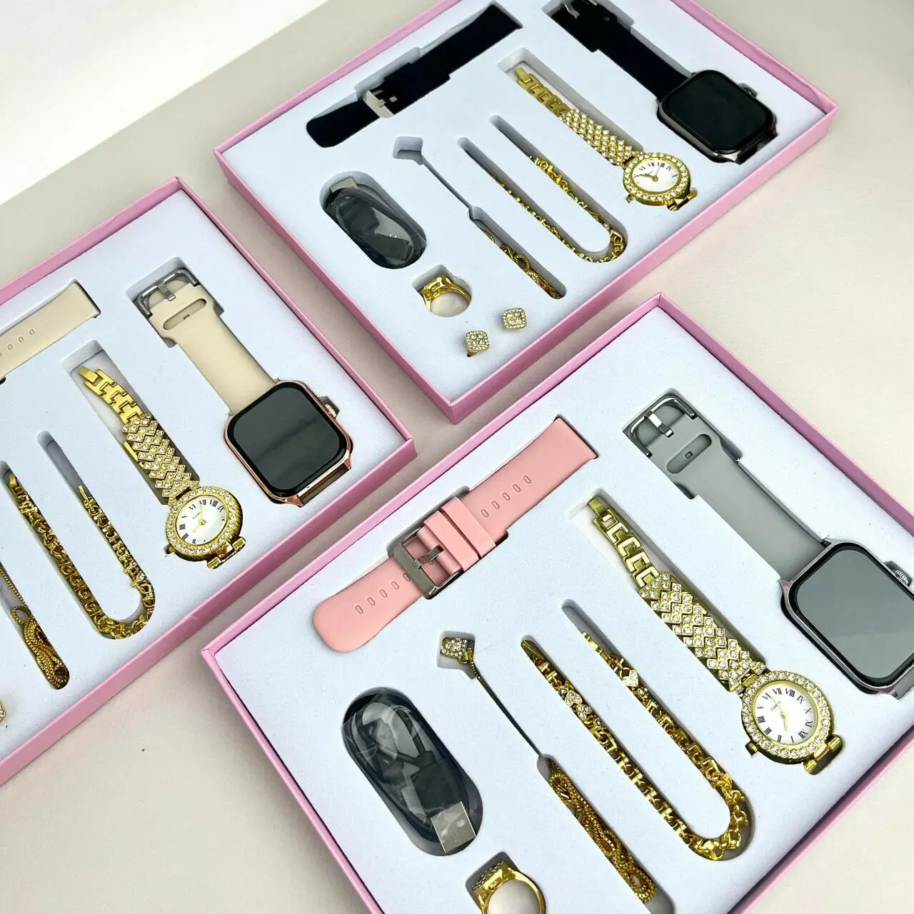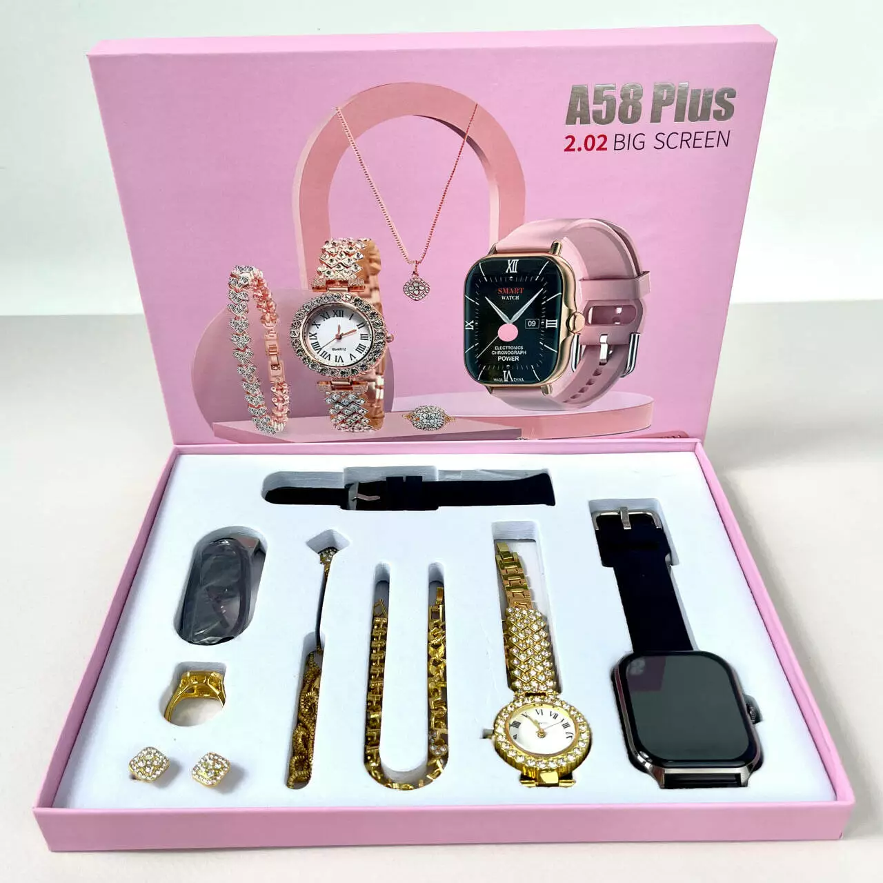 Комплект A58 Plus 7в1 - это идеальное сочетание элегантности и функциональности. Он состоит из смарт-часов, изысканных золотистых кварцевых часов, браслета, сережек, кольца и цепочки с подвеской. Этот набор создан для тех, кто ценит стиль, комфорт и функциональность. Он идеально подходит как для повседневного использования, так и для особых событий. Смарт-часы помогут вам всегда оставаться на связи и следить за здоровьем, а классические золотистые часы и набор украшений добавят изысканности вашему образу. В комплекте вы найдете все необходимое для создания гармоничного сочетания моды и технологий.