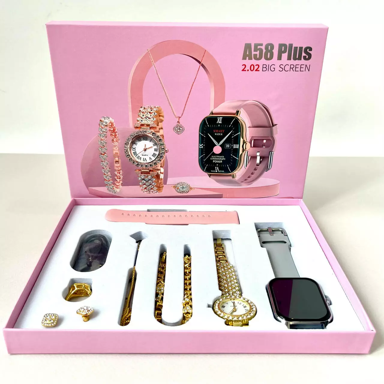 Комплект A58 Plus 7в1 - это идеальное сочетание элегантности и функциональности. Он состоит из смарт-часов, изысканных золотистых кварцевых часов, браслета, сережек, кольца и цепочки с подвеской. Этот набор создан для тех, кто ценит стиль, комфорт и функциональность. Он идеально подходит как для повседневного использования, так и для особых событий. Смарт-часы помогут вам всегда оставаться на связи и следить за здоровьем, а классические золотистые часы и набор украшений добавят изысканности вашему образу. В комплекте вы найдете все необходимое для создания гармоничного сочетания моды и технологий.