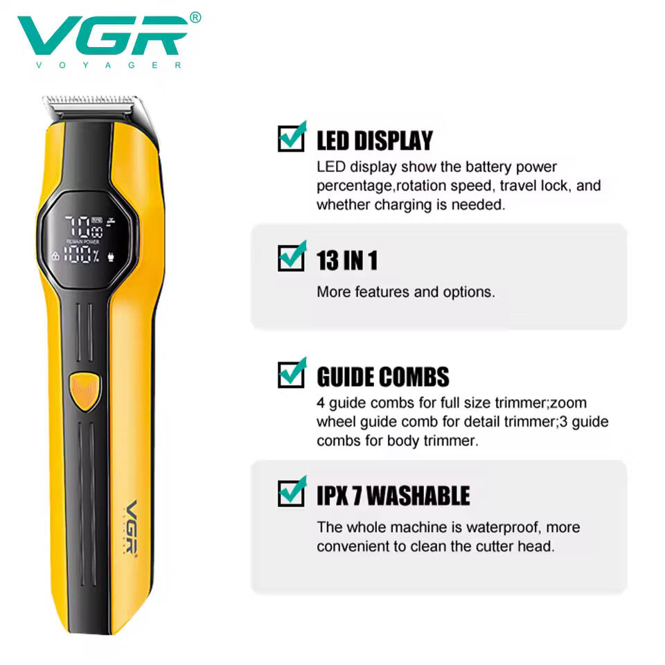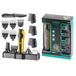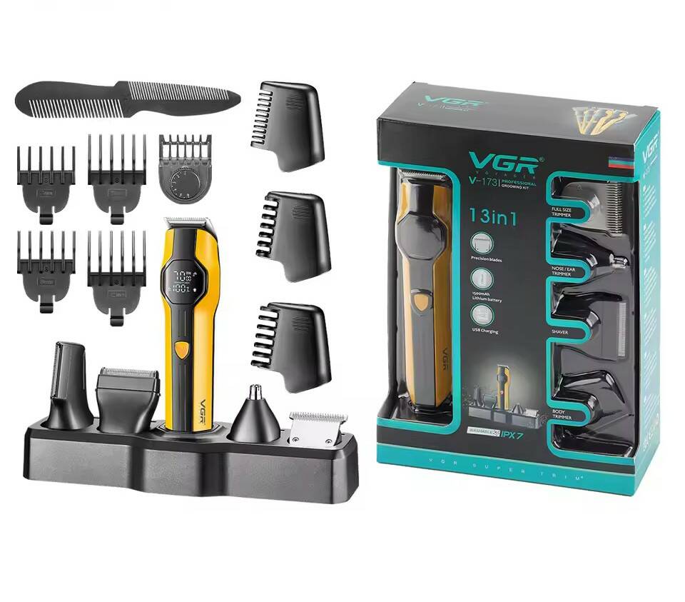 Набір для стрижки VGR V-173 з 13 насадками LED (Жовтий) — багатофункціональний комплект для догляду за волоссям, бородою, вусами, тілом, а також для точного підрівнювання та видалення волосків у носі чи вухах. У наборі 13 насадок: 4 ріжучі голівки, 7 гребенів різної довжини, насадка для деталізації та гребінець, що дозволяє створювати будь-який стиль. Потужний мотор і леза з нержавіючої сталі забезпечують чистий і точний зріз. LED-дисплей відображає рівень заряду, а ємний акумулятор на 1500 mAh гарантує до 210 хвилин автономної роботи. Заряджання через USB-Type-C займає близько 2,5 години. Ергономічний корпус із якісного ABS-пластику робить використання зручним як вдома, так і в дорозі.