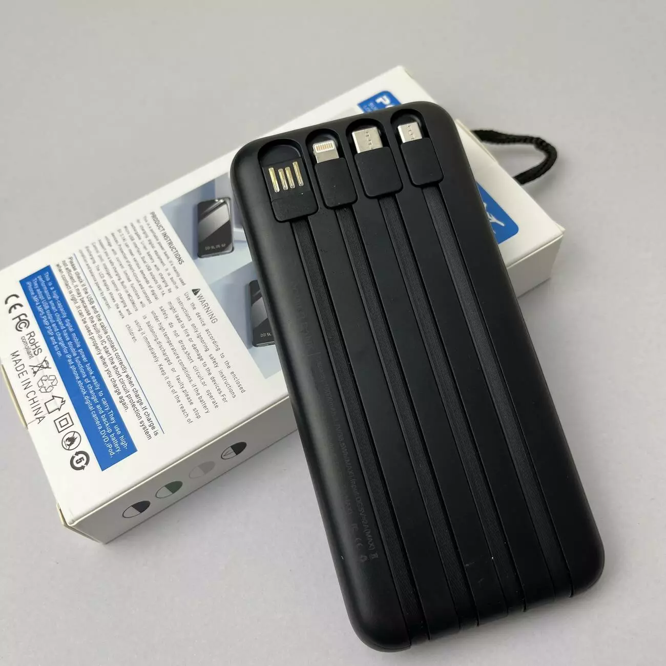 Power Bank Fast Charge с кабелем USB+Micro+Type-C+Lightning (10000mAh) - Портативное зарядное устройство Power Bank Fast Charge (10000 mAh) является отличным компактным вариантом портативного зарядного устройства. Имеет 4 разных кабеля на выход, фонарик и светодиодные индикаторы для отслеживания уровня заряда устройства. Этот Power Bank сочетает в себе скорость и надежность. Возможность подключить 4 гаджета одновременно, что очень ускоряет процесс зарядки. LED индикатор, отображающий уровень заряда аккумулятора. Отличный вариант для путешествий или на повседневную жизнь.