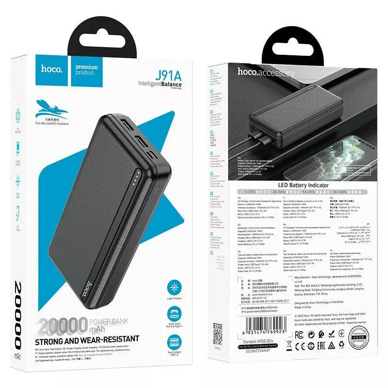 Power Bank Hoco J91A 2USB+Micro+Type-C (20000mAh) - Портативное зарядное устройство Power Bank Hoco J91A сочетает в себе скорость и надежность. Возможность подключить 2 гаджета одновременно, что очень ускоряет процес зарядки. LED индикатор, отображающий уровень заряда аккумулятора. Отличный вариант для путешествий или на повседневную жизнь.