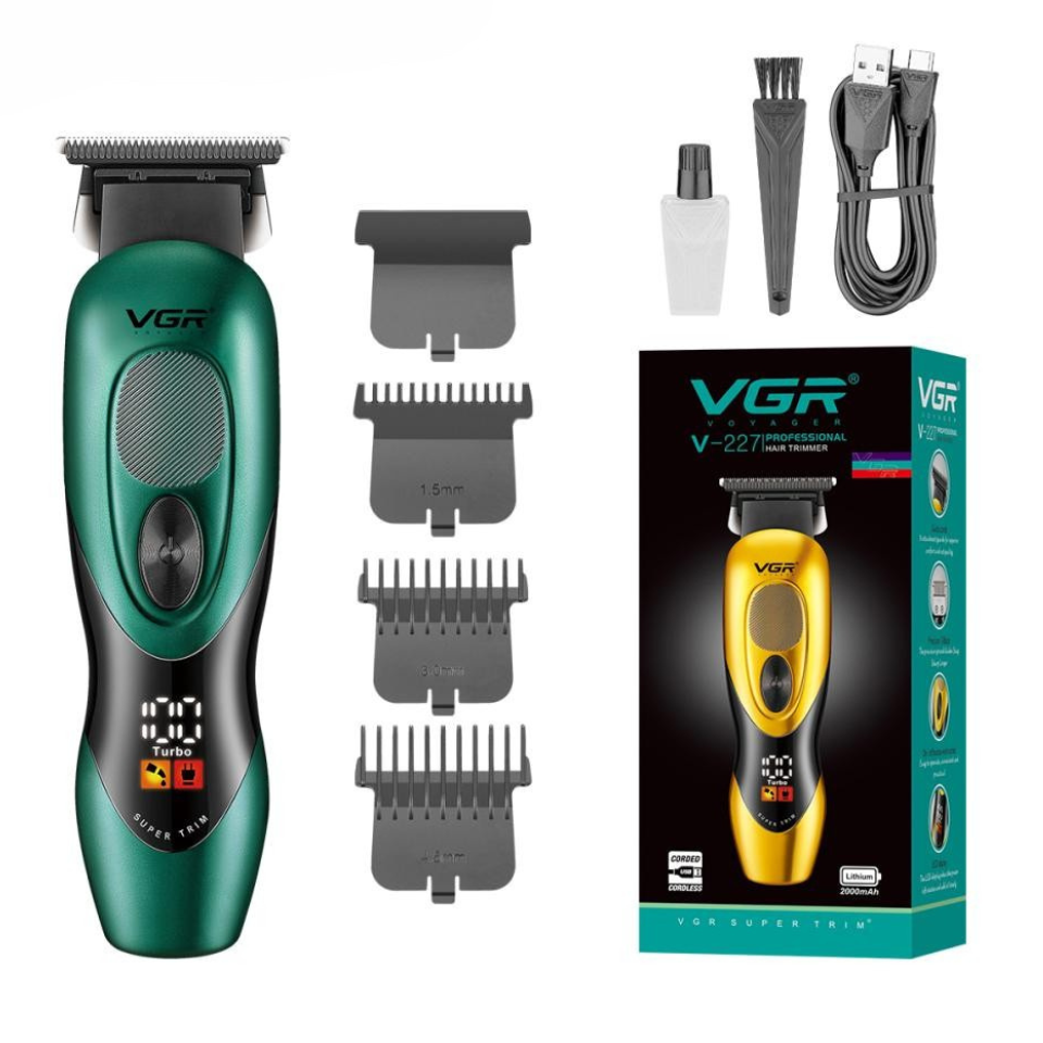 Тример VGR V-227 — стильний та ергономічний інструмент для догляду за волоссям, бородою та вусами. Металевий корпус забезпечує комфорт у руках і довговічність. LED-дисплей дозволяє контролювати рівень заряду та активувати турбо-режим для швидкого й точного підстригання.