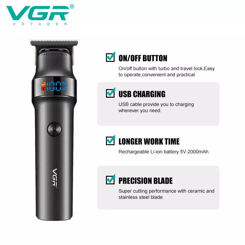 Тример VGR V-987 — потужний і професійний інструмент для догляду за волоссям та бородою, створений для тих, хто цінує точність, автономність та сучасний дизайн. Оснащений високошвидкісним мотором, турбо-режимом та інтелектуальним LED-дисплеєм, цей тример забезпечує комфортне та ефективне користування навіть у найскладніших умовах.